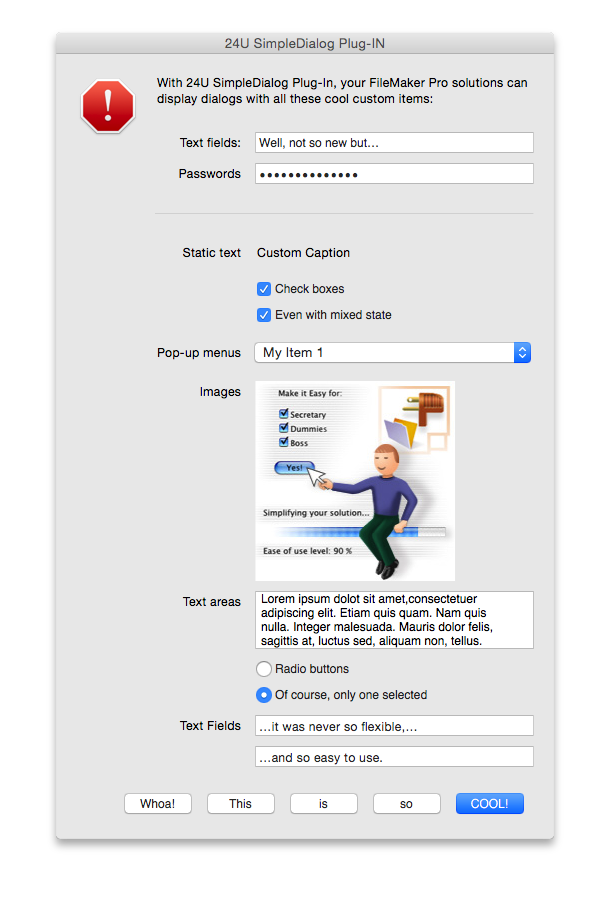 SimpleDialog allows your FileMaker solutions to interact with users via professionally looking dialogs to provide excellent user experience with minimum development effort.