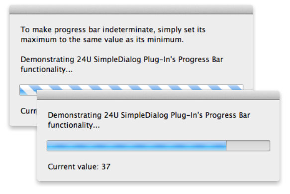 SimpleDialog your script can easily display a dialog with a progress bar and two text messages. Multiple dialogs can be displayed at the same time and updated on-the-fly while your script keeps running.