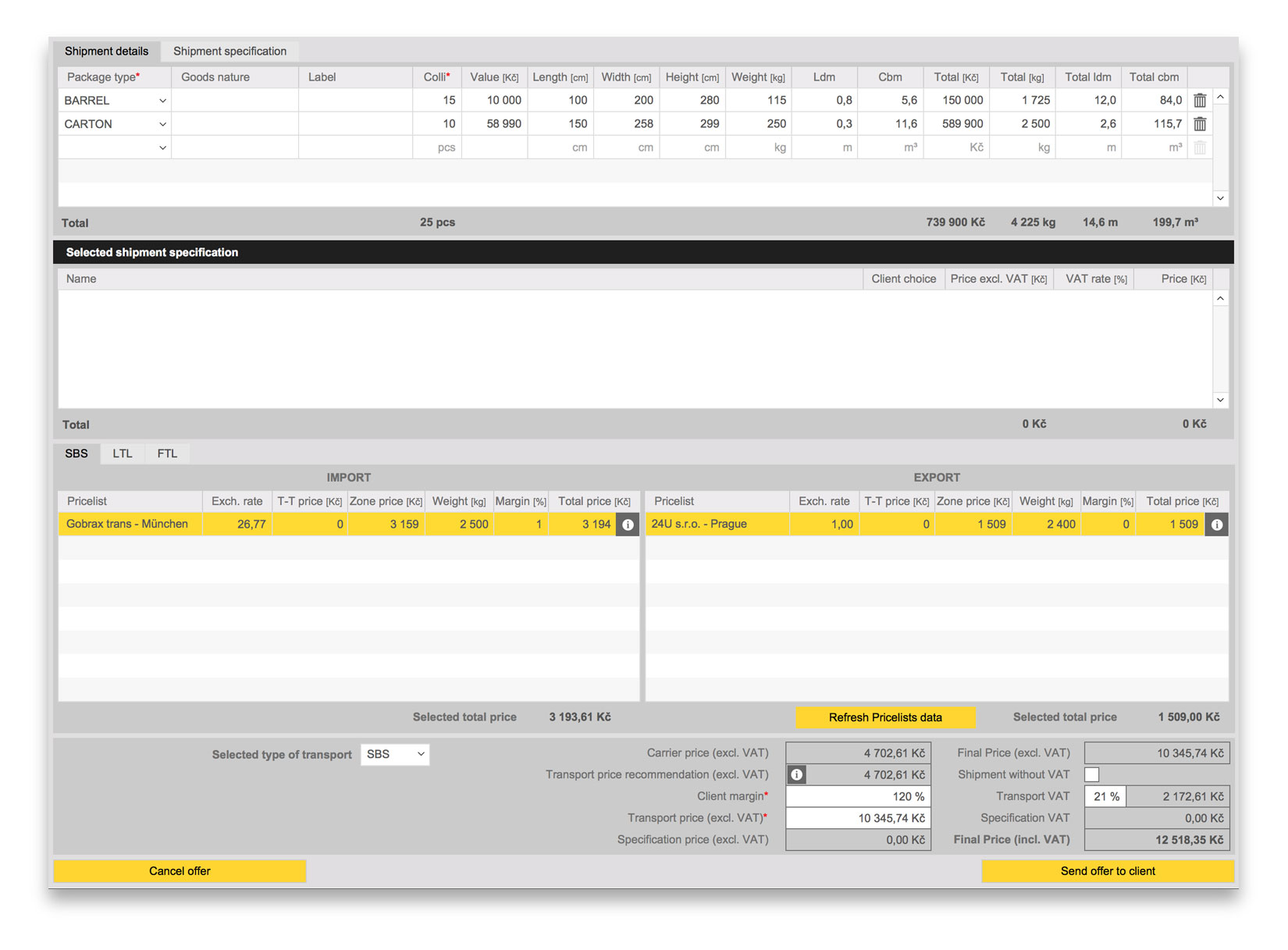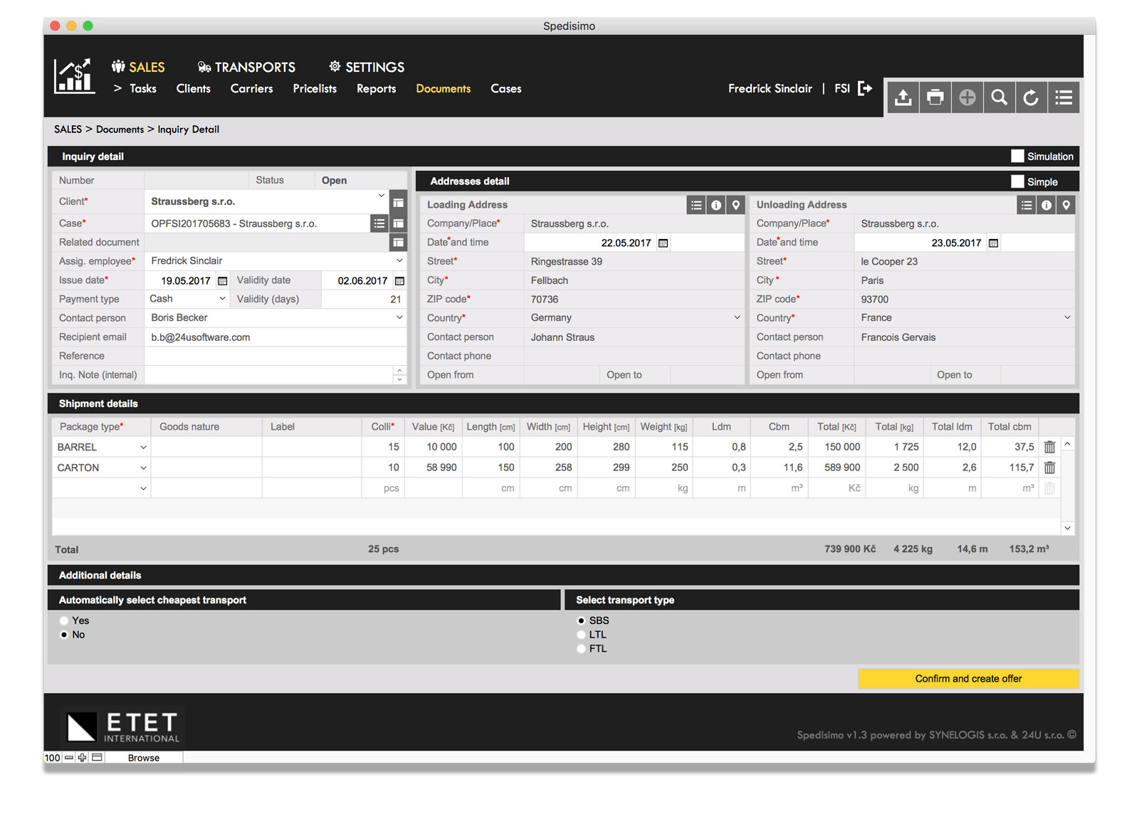 Spedisimo is a modern brokerage system for international freight transportation logistics. Intended for international logistic companies with typically between 10 and 100 users per site, efficiently divided to sales (accepting shipment orders) and dispatching (managing the transportation logistics) processes.