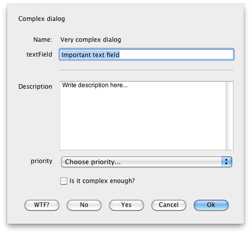 dialogButtonsThe names of dialog buttons, right to left, separated by "¶". If this parameter is omitted dialog will have no buttons. The default value is "" empty string which has special meaning: generate buttons OK and Cancel.