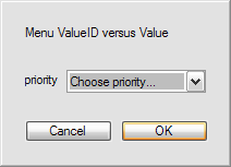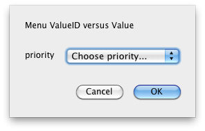 "menu"Dialog pop-up menu. Use parameters valueList and valueIDs to set its contents. CurentValue can be text or number. Number specifies which line of valueList should be the default. 0 or 1 means the first line, 2 is the second line and so on. If you place text to the currentValue, it will either select line from valueList with the same string or it sets initial text of the menu which will disappear when you select the menu. If you define single "-" on one line inside ValueList parameter, the plug-in will draw a separator line between menu lines. This separator line has no index. You can add or remove any number of separator lines and index number in CurrentValue parameter will point to the same line. Separators are not paired with ValueIDs.